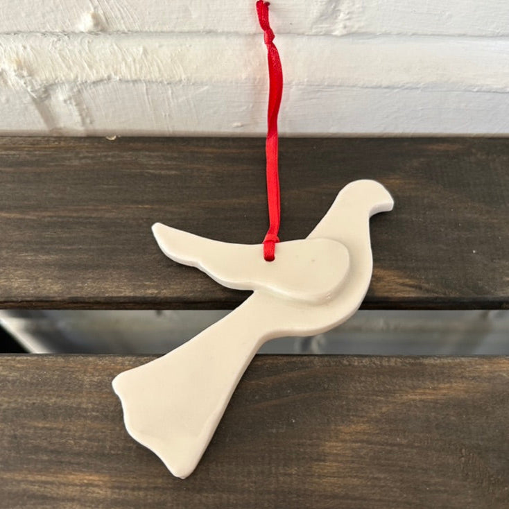 A handmade porcelain dove ornament with clear glaze, and a red ribbon.